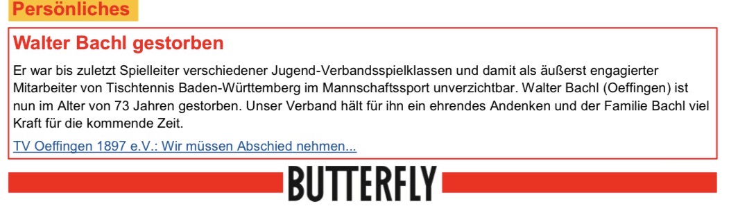 Walter war über Jahrzehnte hinweg ein fester Bestandteil unserer Tischtennisgemeinschaft beim TV Oeffingen. Sein Engagement ging weit über das gewöhnliche Maß hinaus: Als langjähriger ehrenamtlicher Funktionär und Betreuer prägte er das Vereinsleben unserer Abteilung entscheidend mit.